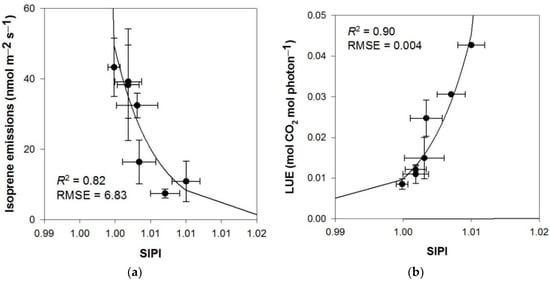 Results of exponential correlation (y = a × ebx) between (a) foliar isoprene emissions and simple independent pigment index (SIPI); (b) LUE and SIPI.