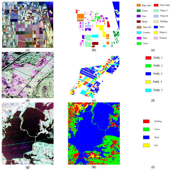 Pauli-RGB images of the three experimental datasets and the ground-truth maps: (a) Pauli-RGB of AIRSAR imagery; (b) Ground-truth map for the AIRSAR imagery; (c) Land-cover categories of AIRSAR imagery;(d) Pauli-RGB of UAVSAR imagery; (e) Ground-truth map for the UAVSAR imagery; (f) Land-cover categories of UAVSAR imagery; (g) Pauli-RGB of RadarSat-2 imagery; (h) Ground-truth map for the RadarSat-2 imagery; (i) Land-cover categories of RadarSat-2 imagery.