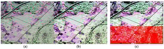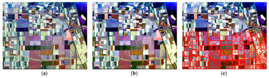 As shown in Figure 3a, PolSAR imagery is usually affected by speckle noise, which leads to the AIRSAR imagery to still have finely divided spots despite the speckle filtering in Figure 3b. For this reason, the GSRM algorithm is used to segment original AIRSAR image. To avoid the phenomenon of over-segmentation or under-segmentation, the segmentation parameters are set during the GSRM segmentation in this paper and we found the segmentation parameters which the scale parameter Q is 32 and the gradient threshold Δ is 0.5 can better retain details and preserve the shape of small land parcels than other scale parameters or gradient thresholds by visual assessment. The number of regions is 2235 and average number of pixels per region is 343, where the red line is the boundary of homogeneous area in Figure 3c. The result shows that GSRM segmentation can better suppress the influence of speckle noise than traditional filtering methods.
