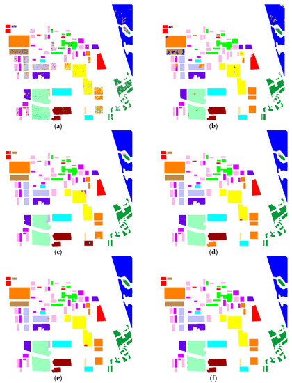Classification results obtained for the AIRSAR imagery with the different strategies: (a) MBT_pixel; (b) MBT_T3; (c) RS; (d) MI; (e) BT; (f) MBT.