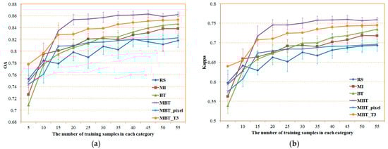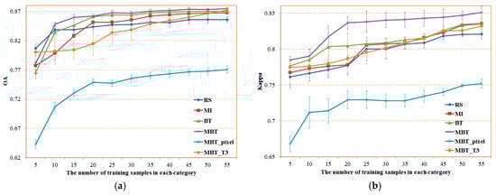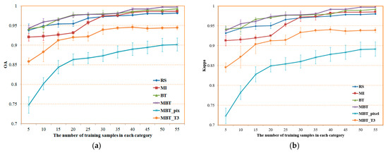 Figure 5 shows the classification accuracies with different numbers of training samples from the different strategies. The horizontal axis represents the number of training samples and the vertical axis represents the OA or Kappa. It can be seen that the classification performances become stable when the samples in each category are more than 50, and the performance of the MBT strategy is the best among the different strategies of sample selection when the samples in each category are more than 35.