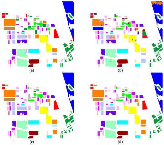 Classification results obtained for the AIRSAR imagery with the different classification algorithms: (a) KNN classifier; (b) Wishart classifier; (c) LOR-LBP classifier; (d) RF classifier.