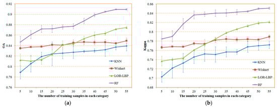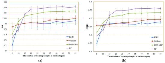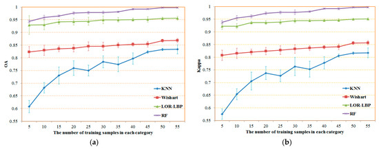 Figure 13 shows the classification accuracies with different numbers of training samples from the different classification algorithms. The horizontal axis represents the number of training samples, and the vertical axis represents the OA or Kappa of the different classification algorithms. Analogously, the performance with the RF classifier remains the best among the different classification algorithms.