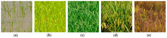 Five different growth stages of paddy: (a) stage of tillering; (b) stage of stem-elongation; (c) stage of panicle-exsertion; (d) stage of flowering; and (e) stage of ripening.