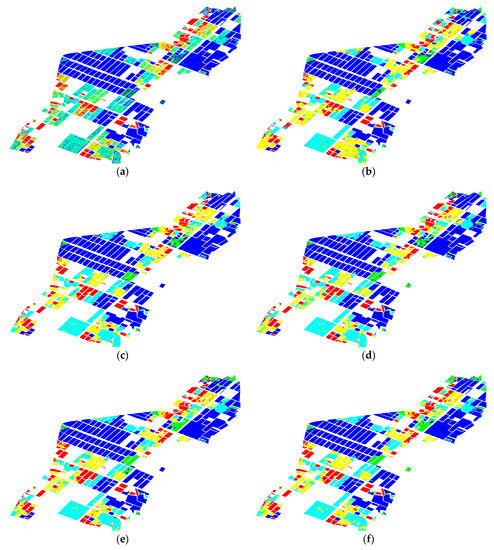 To quantitatively compare the classification results with different classification algorithms, four different classification algorithms were also considered. In detail, we first randomly selected five training samples per class as the initial training set, which was done spatially by randomly selecting the segmented objects within a class and that all the polarimetric parameters were considered in this step; in the second step, five samples per class were selected using the MBT strategy of sample selection at each iteration, with the stopping criterion of the iteration set to 10 times; and the four different classification algorithms were finally applied to identify the different types of land cover in the UAVSAR imagery. Figure 12 shows the classification results obtained with the UAVSAR imagery when 55 samples in each category are picked using the different classification algorithms.