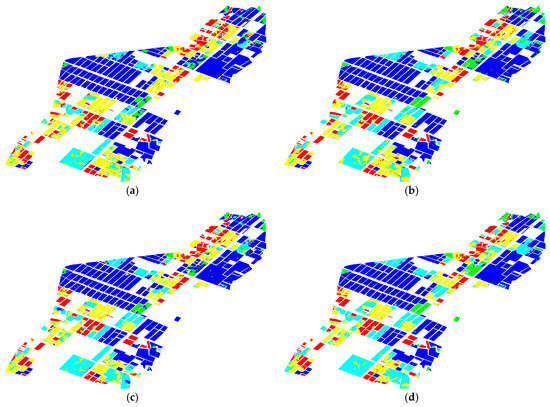 In detail, we first randomly selected five training samples per class as the initial training set, which was done spatially by randomly selecting the segmented objects within a class and that all the polarimetric parameters were considered in this step; in the second step, five samples per class were selected using the MBT strategy of sample selection at each iteration, with the stopping criterion of the iteration set to 10 times; and the four different classification algorithms were finally applied to identify the different types of land cover in the AIRSAR imagery. Figure 6 shows the classification results obtained with the AIRSAR imagery when 55 samples in each category are picked using the different classification algorithms.