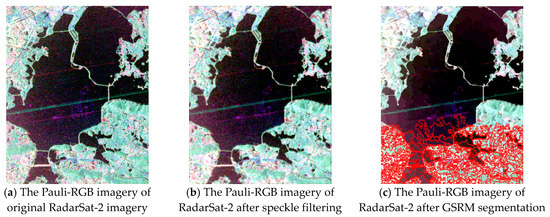 The Pauli-RGB imagery of UAVSAR after speckle filtering and GSRM segmentation: (a) The Pauli-RGB imagery of original RadarSat-2 imagery; (b) The Pauli-RGB imagery of RadarSat-2 after speckle filtering; (c) The Pauli-RGB imagery of RadarSat-2 after GSRM segmentation.