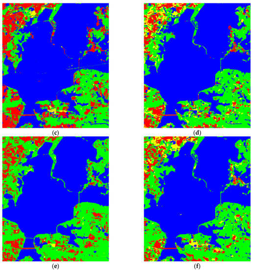 Classification results for the RadarSat-2 imagery with different strategies: (a) MBT_pixel; (b) MBT_T3; (c) RS; (d) MI; (e) BT; (f) MBT.
