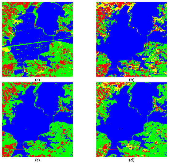 Classification results for the RadarSat-2 imagery with the different classification algorithms: (a) KNN classifier; (b) Wishart classifier; (c) LOR-LBP classifier; (d) RF classifier.