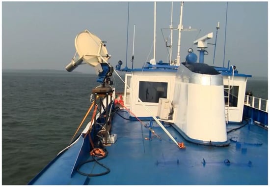 Experiments on radar probing of film slicks were carried out in the southern part of the Gorky Water Reservoir (GWR) of the Volga River, Nizhny Novgorod Region, Russia. GWR extends approximately from north to south for about 100 km, and its width is 5–15 km. Artificial film slicks in the experiments of 2014 and 2015 were observed with satellite TerraSAR-X operating at a frequency of 9.65 GHz. Experiments of 2016 were performed using a new three-band radar designed at the Institute of Applied Physics, Russian Academy of Sciences (IAP RAS). It is a Doppler radar, operating in the X-, C-, and S-bands at frequencies of 10 GHz, 6 GHz, and 3 GHz, respectively, and at vertical transmit/receive (VV) and horizontal transmit/receive (HH) polarizations of electromagnetic waves in each band. The three-band radar operates in a pulse regime radiating 30-ns pulses. The beam width of the radar pattern is about 0.03 rad (X band), 0.05 rad (C-band), and 0.1 rad (S-band). The dynamic range of the radar signal is about 55 dBs in electronic channels, and is enhanced after digital processing. The radar was mounted onboard a research vessel at a height of about 7 m, looking at an incidence angle of 60° and at an azimuth angle of about 40° to the left from the ship’s heading. A photograph of a ship based X-/C-/S-band radar is shown in Figure 1.