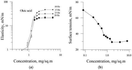 Elasticity at several wave frequencies (a) and surface tension at wave frequency of 25 Hz (b) as a function of the surfactant concentration for OLE films (cf., []).