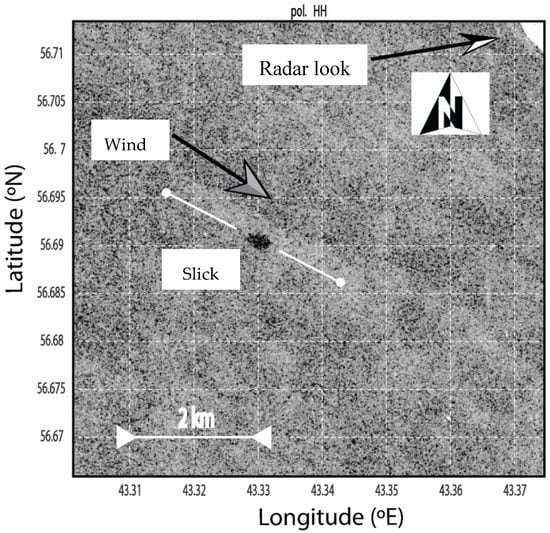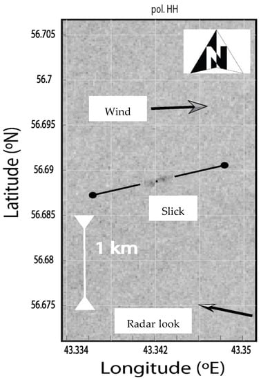 A fragment of a VV polarization image of an OLE slick in the experiment of 31.08.2014 (TerraSAR-X ascending pass) is shown in Figure 3.