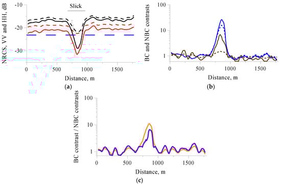 Profiles of NRCS at VV and HH polarizations, BC and NBC contrasts and their ratio for the case of 31.08.2014 are presented in Figure 4. Note, that the contrasts in Figure 4 are current contrasts, which were calculated as ratios of mean background values, chosen well outside a slick to the current BC or NBC values along a slick transect.