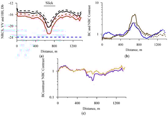 It is seen that the noise floor of the three-band radar was well below the radar returns in the slick area for both VV and HH polarizations in all bands, so that one can reliably affirm that BC and NBC contrasts are close to each other. In more detail, the NBC contrast in S-band is practically equal to the BC contrast, in C- and X-bands the reduction of NBC is slightly larger than for BC.
