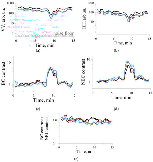 Figure 6 indicates that NRCS both for VV and HH-polarizations for the experiment of 03.08.2015 are well above the noise floor, so that the BC and NBC contrast values are more reliable than for the previous case. It follows from Figure 6c that the NBC contrast, unlike the case of 31.08.2014, is larger than the BC contrast.