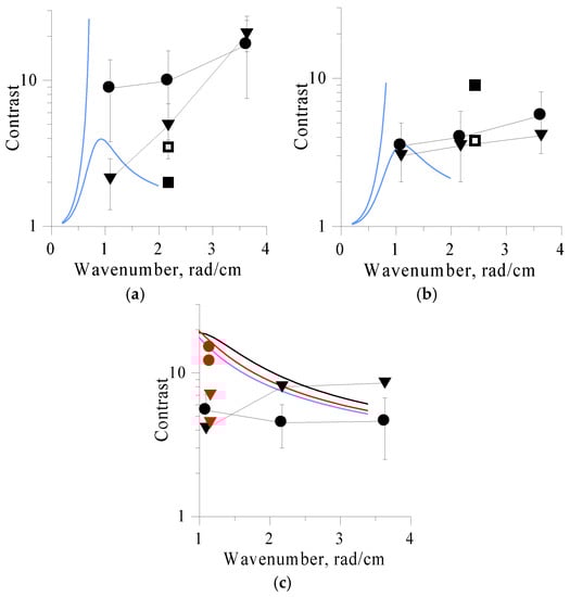 Figure 9 clearly indicates that BC contrasts increase with wave number, except for the cross-wind case, and are highest for an upwind look direction. Similar behavior can be noted for contrasts in the directions close to the downwind, although the downwind contrasts are somewhat smaller than for the upwind case. The theoretical contrasts for up/downwind cases are estimated according to [] at the conditions of experiments (at a wind velocity 7 m/s, E= 20 mN/m, and at two different empirical coefficient values—0.04 and 0.06 in the formula for a wind wave growth rate (see, []). The theory [] has an obvious drawback of being invalid if the wind wave growth rate is close to the damping coefficient. In our case this occurs at wave numbers larger than 1 rad/cm, so at higher wave numbers the theory can be substituted by an empirical model []. Without going into detail of the models one can consider that the reduction of BC radar returns in the slick is due to enhanced viscous damping of short wind waves in the presence of film. This conclusion is also supported by an analysis of cross-wind contrasts. The latter, calculated according to Equation (6), are plotted in Figure 9c. A decreasing tendency of cross-wind BC contrasts with wave number is qualitatively consistent with the experiment. One should note that the elasticity of crude oil films according to recent laboratory measurements [] has been estimated roughly as 25 mN/m, which is compatible with the OLE film elasticity and, thus, the contrast values [] shown in Figure 9c can be considered as complementary to our data.