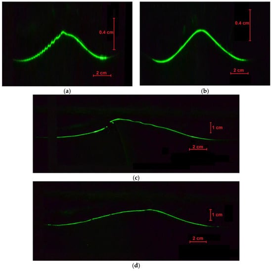 Elevation profiles of steep, short gravity waves of 10 cm (a,c) and 20 cm (b,d) wavelength (left and right columns, respectively), the upper row—clean water (a,b), the bottom row—water contaminated by an oleic acid film (c,d). Waves travel from right to left, and vertical and horizontal scales are extended for clarity.