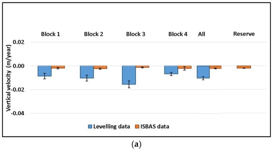 By looking at Figure 10 and Figure 11, it is evident that, although the general trend of the Reserve measured by both the InSAR ISBAS and the levelling methods is that of subsidence, there is spatial variability within the Reserve with some of the ISBAS output points showing uplift, and the pattern of variability differs between that captured by the ERS and Sentinel-1 satellites. Taking each Block individually, it is the case that the levelling data shows an approximately linear trend of motion in all four blocks (Figure 10a,b); however, the variability of the velocity is greater than the variability in velocity measured with the InSAR ISBAS data. As a case in point, during the two-year period covered by the Sentinel-1 data, the average of the levelling measurements per block indicate that three blocks were subsiding (block 1 with 0.04 m/year, block 2 with 0.004 m/year and block 4 with 0.003 m/year) and one block (block 3) experienced uplift of about 0.003 m/year (Figure 10b). Although caution is required here as levelling measurements were only made on two occasions and also the final measurement made was prior to the end date of the Sentinel-1 acquisitions, it is the case that comparison with the Sentinel-1 measurements (Figure 10b and Figure 11b,c) indicates a mismatch with block 3, with both temporal baseline outputs showing subsidence, albeit at small rates, rather than uplift during this period.