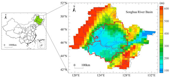 The Songnen Plain (red polygon) in the Songhua River Basin, Northeast China. The right figure is an elevation map of the basin.