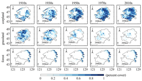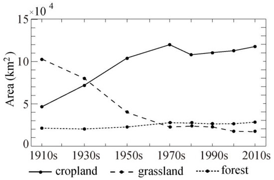 Trajectories of areal coverage of the three primary land use and land cover (LULC) classes (grassland, cropland, forest) in the 1910s–2010s.