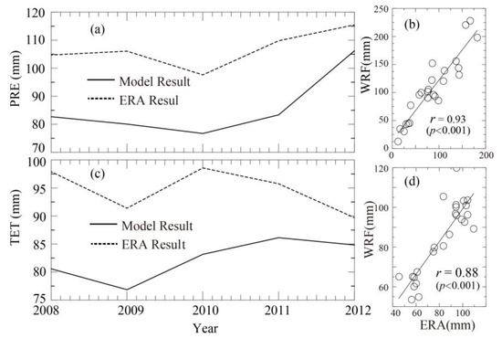 Comparison of the Weather Research and Forecasting (WRF) simulated and European Reanalysis (ERA) Reanalysis of precipitation (a) and total evapotranspiration (c) in 2008–2012. (b–d) are scatterplots of precipitation (PRE) and total evapotranspiration (TET), respectively.