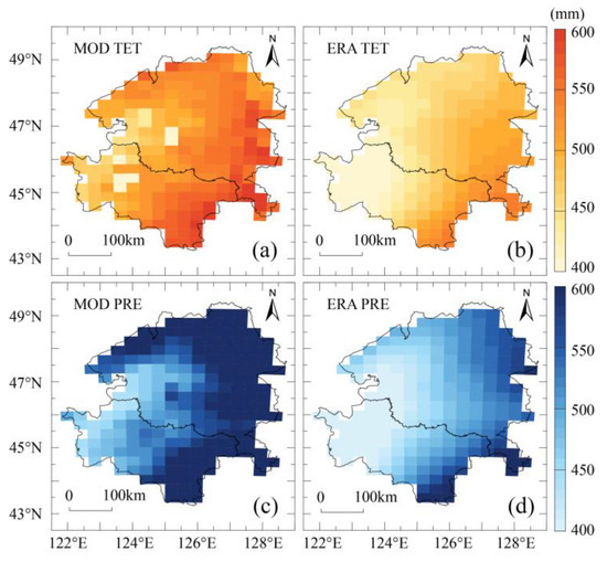 The spatial patterns of total evapotranspiration and precipitation: the WRF-modeled (a,c) and ERA Re-analysis (b,d). Each grid value is a 5-year average in the growing season (May–September).