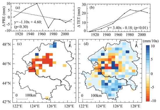 The grid-level centurial trends of the PRE and TET deviations from the 1910s were also mapped in the study region. A linear trend analysis was performed and only the grids with statistically significant trends were mapped in Figure 6c,d. Although Figure 6a does not show a significant ΔPRE trend plainwide, its grid-level trends in Figure 6c reveal a statistically strong decrease in the central plain in a rate of 5–10 mm/10a, where agricultural expansion was actually less intensified (as shown in Figure 3). For spatial patterns of the ΔTET (Figure 6d), trends in both directions are observed. Similar to the ΔPRE distributions in Figure 6c, the ΔTET in Figure 6d also shows decreasing trends in the central plain. Different from the mono-directional ΔPRE patterns, however, the ΔTET shows statistically significant two-way changes. While the central plain also has a decreasing trend (red grids in Figure 6d), other areas all over the study region reveal weak yet statistically increasing trends (the blue grids in Figure 6d). In comparison with the land use maps in Figure 3, areas with increasing ΔTET have undergone intensive agricultural expansion in the past 100 years. It is reasonable to conclude that the total evapotranspiration increased after the permanent grass covers were replaced by annual crops. The significant decrease of local precipitation in the less disturbed central plain may reflect the localized drying effects by agricultural expansion.