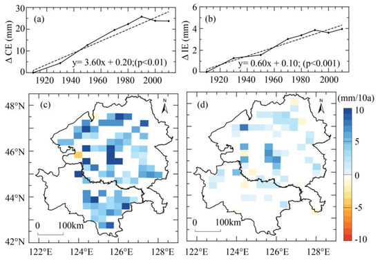 The vegetation-related variables of water balance are the CE and IE. In Figure 7, their plain-wide decadal deviations against the 1910s are statistically significant, reaching a rate of 3.6 mm/10a for the ΔCE (Figure 7a) and 0.6 mm/10a for the ΔIE (Figure 7b). The absolute amount of change to the CE is much higher than the IE because the CE is a continuous physiological process of vegetation along its growth. The IE is mainly effective during rainfall. Grasses have relatively lower canopy cover and green biomass than annual crops. Conversion of grasslands to croplands thus creates stronger effects on the CE than the IE.