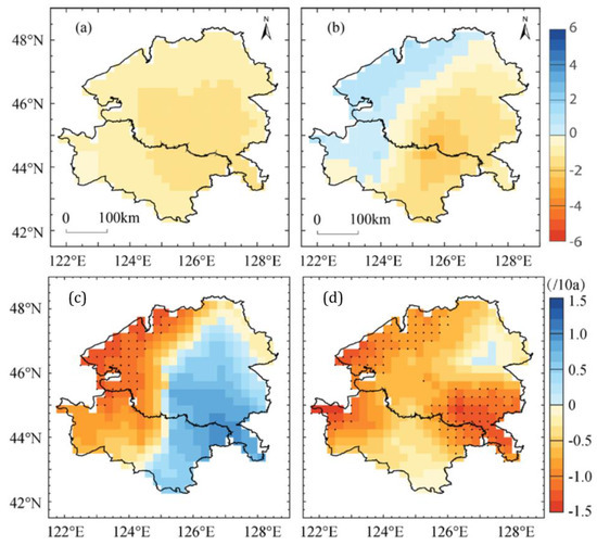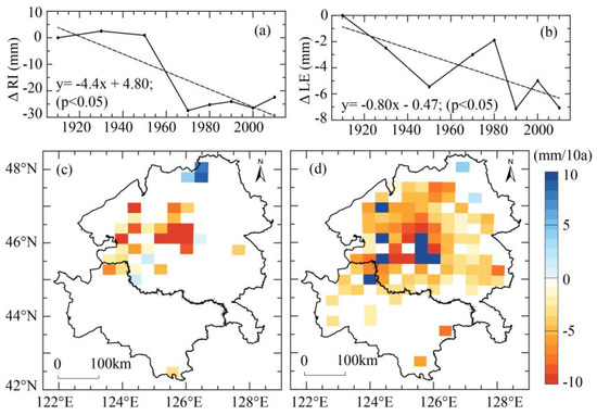 The soil-related variables of water balance are the RI and LE. Their plain-wide deviations against the 1910s statistically decreased at a rate of −4.4 mm/10a for the ΔRI (Figure 8a) and −0.8 mm/10a for the ΔLE (Figure 8b). In the 1910s–2010s, the RI decreased 34.2 mm and the LE decreased 6.4 mm. While the LE decrease indicates less water loss from land evaporation, the decrease of RI dramatically outcompetes the decrease of the LE, also indicating a drying trend of soil moisture in the study region. In their grid-level spatial distributions, water loss in the central plain is apparent from the decreasing trends of both ΔRI (Figure 8c) and ΔLE (Figure 8d). Especially in the central plain where large areas of wetlands remain nowadays, a drying trend is suggested by a strong decrease of the RI. This is in agreement with the spatial patterns in Figure 6 and Figure 7 above.