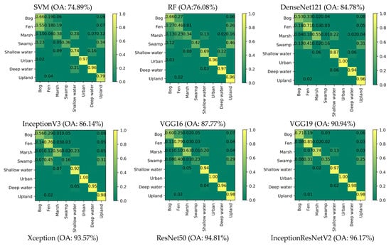 The confusion matrices demonstrate that, by using the last three networks, a significant improvement was achieved in the accuracy of both overall and individual classes. In particular, InceptionResNetV2 correctly classified non-wetland classes with an accuracy of 99% for deep water and 100% for both urban and upland classes. ResNet50 and Xception were also successful in distinguishing non-wetland classes with an accuracy of 100% for urban and 99% for both deep water and upland. One possible explanation for why the highest accuracies were obtained for these classes is the availability of larger amounts of training samples for non-wetland classes relative to wetland classes.