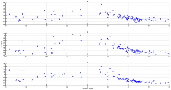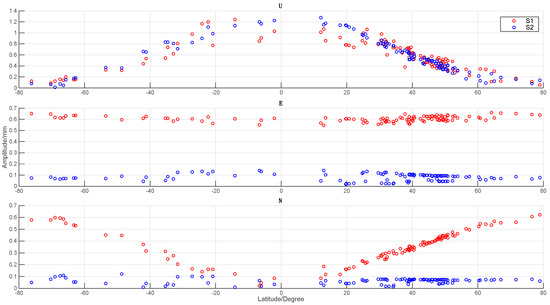 Figure 2, we observe that both the S1 and S2 tides could result in big vertical annual movements, and the predominant effect is latitude dependent, among which the amplitudes of stations near the equator are larger than 1 mm. This is easy to understand, as both the diurnal and semidiurnal surface pressure variation are decreased with the increasing latitude. For the horizontal components, the impacts are much smaller, in particular for the S2 tide, whose global annual amplitudes are less than 0.2 mm for both the North (N) and East (E) components. The magnitude of the S1 tide is a little bigger compared with the S2 tide. Specifically, the annual amplitude for the East (E) component of S1 is within the range of 0.5–0.7 mm globally without the latitudinal dependence, while the amplitude for the North (N) component becomes larger with the increasing latitude, and the biggest variation is concentrated above the latitude of ±60° at around 0.6 mm. This is because the S1 and S2 tides here are induced by surface heating, and the horizontal thermally driven force is predominantly diurnal. Additionally, there is a strong North-South temperature gradient existing in the daily heating system, which caused the latitudinal dependence of S1 amplitude for the North (N) component.