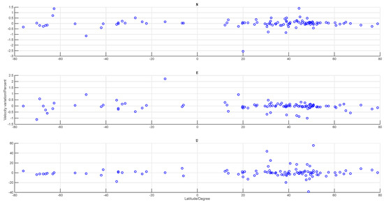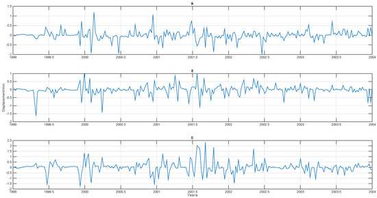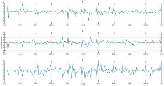 Besides, the RINEX GPS observation files are on a daily basis, e.g., one file per day, and the obtained daily time series is indeed a 24-h average value. Therefore, the “continuous” in GNSS Geodesy usually refers to continuous observations, not the solutions, as both the daily or weekly solutions are a kind of average. As long as the GPS observation data during the selected time span is continuous, and the time span is long enough, either solution (daily, weekly, monthly, etc.) could be used to study the characteristics of the stations’ movement. Their difference only comes from the data selection of different sampling rates. Here, we calculate an approximate weekly solution. Our whole data span is five consecutive years, and the shortest time period is about 1.6 years (