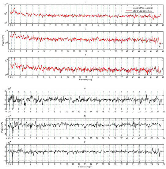 At last, the spectral characteristics of the global IGS stations caused by S1/S2 is analyzed. Our results show that the S1/S2 correction could partly reduce the annual and semi-annual amplitudes of the U component together with the semi-annual amplitude of the E component, but the annual and the semi-annual amplitudes of the N component exhibit a significant increase. Furthermore, most long-term periodic signals with a frequency equal to or smaller than 1 cpy in the U component also decreased to some extent after correcting the S1/S2 effects. We also find that adding the S1/S2 correction could significantly reduce the power of the 4th draconitic signal of the anomalous harmonics of 1.04 cpy ± 0.008 cpy in the U component and the 2nd draconitic signal in the N component, but the other anomalous harmonics exhibit an amplitude increase, which partly confirms Tregoning and Watson’s finding that S1/S2 may also be a possible source that caused the anomalous harmonics of 1.04 cpy.