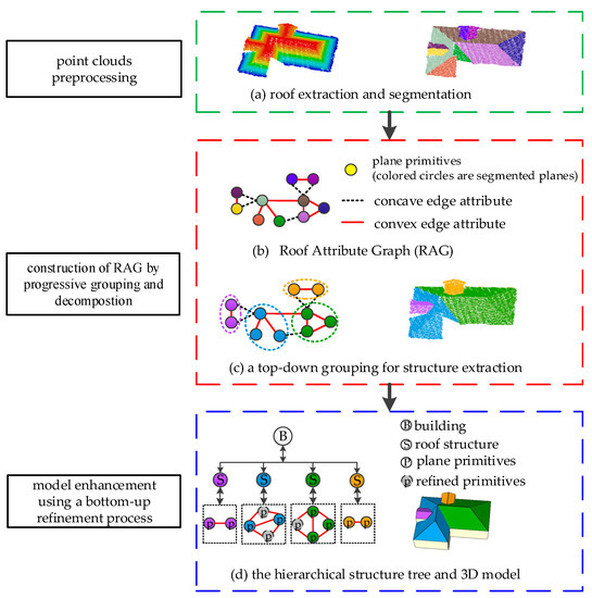 A flowchart of the proposed building reconstruction scheme is illustrated in Figure 1. Taking the building point cloud as the input, a preprocessing step, including roof extraction and segmentation, was adopted for the roof point clouds (a). A Roof Attribute Graph (RAG) was generated between the roof planes (b), and planar segments were grouped into a meaningful structure based on the RAG and an unambiguous top-down decomposition (c). To enhance the grouped structures and construct a set of visually completed 3D models, bottom-up refinement was adopted. The final output contains hierarchical roof structures with their associated topology (d). The Gestalt laws for the reconstruction were proximity, similarity, continuity, and closure. Detailed information about the preprocessing steps on the roof extraction and segmentation can be found in [46].