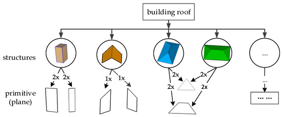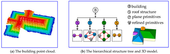 Every complicated building can be reconstructed from a set of simple and meaningful structural models, which consists of various parameterized primitives based on an RAG. As presented in Figure 2, these grouped sub-graphs can be combined into a hierarchical structure tree for the building roof. The tree root stands for the whole model, while the structures and extracted roof primitives can be taken as child nodes or leaves. A structure can be a combination of two or more parametric planar primitives, or even a continuous surface. In this paper, we examine the structured scenes, where planes are the main objects, and are organized as a vertex of the RAG.