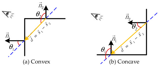 where the normal and centroids of two planes are and , . The convex and concave attributes are illustrated in Figure 3.