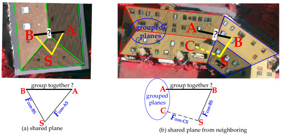 To find a plausible decomposition of roof structures from the RAG, a progressive grouping was used, which was aimed at searching and finding the best set of planar primitives that potentially belonged to the same group (a structure). One iteration of the grouping process to find a roof structure is illustrated in Figure 6.