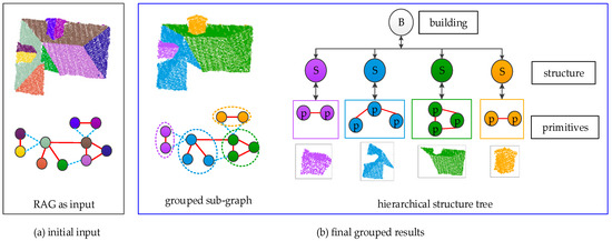 To find the meaningful structures from the RAG and generate a hierarchical tree of a building, a progressive iterative grouping algorithm was proposed, as illustrated in Figure 5, where the sub-graphs for building structures are represented by different colors.