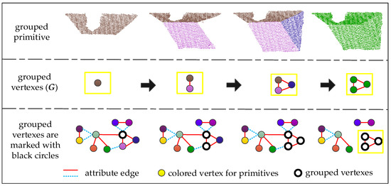 After a group of primitives was found, we updated the tree nodes and removed the vertexes in the RAG. Thus, we then proceeded to the next iteration with a new grouping process until all primitives in the RAG were grouped.