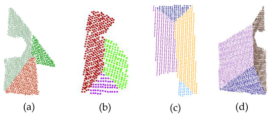 - the remaining candidate primitives based on the Euclidian distance () between the candidate plane and plane, , were sorted, and the candidate with the minimum connecting distance into was grouped. If there were no remaining primitives, we exited; and