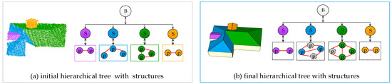 - A grouped structure from the colored node in Figure 10a was searched, and its corresponding sub-node (a child part) and inlier leaf nodes (planar primitives) were extracted;