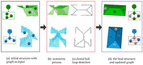 A process of model refinement. (a) Initial grouped structures and the corresponding sub-graph of RAG; (b) symmetry enhancement with structural knowledge; (c) closed hull loop detection by the projected primitives; and (d) the final refined structures and updated graph.