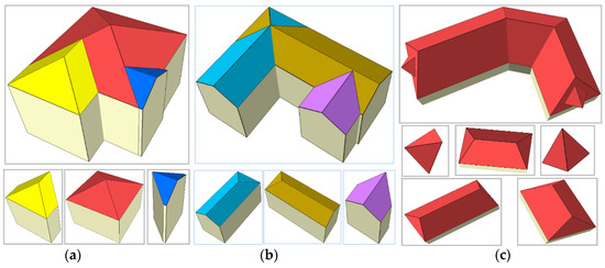 The proposed approach can more effectively identify the unambiguous roof parts using only simple grouping rules as compared to the methods based on the commonly used or improved RTGs [2,37,44,45]. Results from three common decomposition methods (black wireframes) and their reconstructed 3D building models (red models) are illustrated in Figure 15.