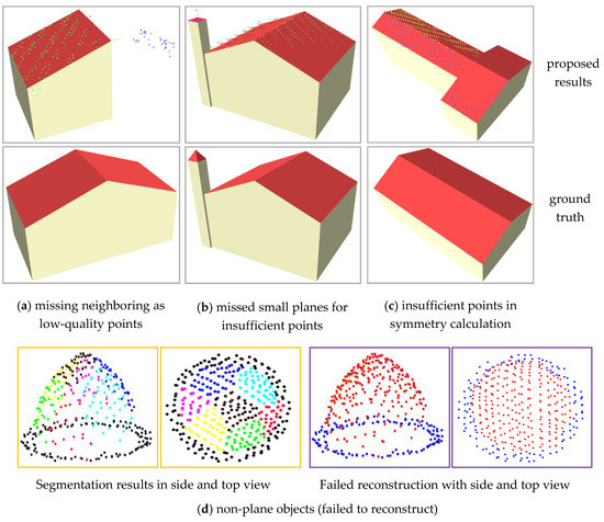 The most common reason for the false construction was a lack of an adjacent plane, which is always caused by insufficient points, resulting from the segmentation preprocess. In addition, model enhancement can be easily hindered by insufficient points or cannot be executed even for sparse partial symmetry. A gable roof plane in Figure 17a was missed due to a sparsity of points, while a chimney in Figure 17b was lost because of the rare and low-quality points for these small planes. A complete and correct model is based on the correct extraction and unambiguous enhancement of the building structure. However, enhancement is greatly affected by data quality. Figure 17c shows an effective reconstruction based on the data, but it did not fit the ground truth because of the incompleteness of the roof points and ambiguous structures. This situation can only be avoided by shape constraints known in advance of the reconstruction. In addition, objects with non-planar structures, as in Figure 17d, can easily lead to a model failure as it is difficult to describe these non-planes with regular planar parameters, but a correct grouped structural point set can be obtained by the proposed approach in the two figures (d) on the right side of Figure 17. The points set colored with red and blue are separated by a gap with no points. These failed reconstructions do not conform to the ground truth, as shown in the top three figures, except for the non-regularized objects appearing as irregular curved surfaces or multilayer surfaces.