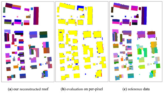 The ISPRS evaluation results are listed in Table 4, showing that the proposed method achieved 130 correctly reconstructed roof planes out of 133 fully reconstructed as True Positive (TP). The quality evaluation on a per-pixel level is shown in (b), captioned as evaluation on per-pixel. The most common reason for the false roof reconstruction was insufficient points for symmetry calculation and unsuccessful building extraction from the point cloud due to vegetation or other objects.
