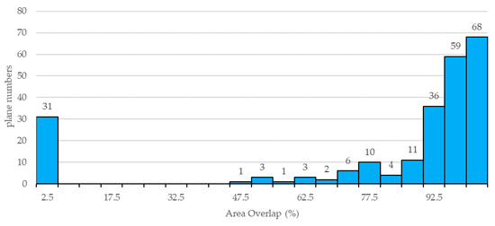 Histograms of the overlapping area related to the corresponding roof planes are shown in Figure 19. The dominant groups contain roof planes whose mutual cover area was greater than 97.5%, based on the ISPRS reference data. Since the symmetry and convexity of a roof structure were assumed, the plane overlap of some models did not fully reach 100%. Interestingly, unsuccessful preprocessing of the extracting building point cloud was the main reason why there were approximately 31 planes (2.5% area overlap) with a low overlapping area.