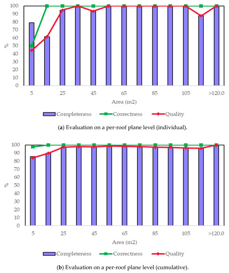 The evaluation of the dependency between the plane size and model quality is presented in Figure 21. It can be seen from the individual histogram that there was a leap between the completeness and quality (planes with an area of 5 m2). This is due to symmetry processing during model enhancement. In addition, the reconstruction completeness was greatly influenced by the accuracy of the roof extraction, as complex roof structures were more likely to be organized by small patches than large planes. These conclusions are in line with the methods based on an RTG library [2,6].