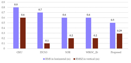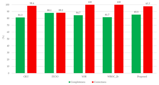 Four state-of-the-art methods from the ISPRS website were compared and visualized in Figure 22. For most of these methods, one of the two indicators exceeded the median value, while the other indicator was reduced. We obtained an 85.5% completeness and 97.7% correctness with our proposed method. The values of the two metrics approached the median, which means that we achieved a relative balance between completeness and correctness. The reason for this balance was the roof plane segmentation method [46], but more importantly, an unambiguous principal direction for the regularization was easily obtained from the locally clustered building structure. As shown in Figure 23, the average root mean squared error (RMSE) values were 0.5 m and 0.29 m in the horizontal and vertical directions, respectively, which indicates that the proposed approach has a high geometric accuracy, as compared to the four state-of-art methods.