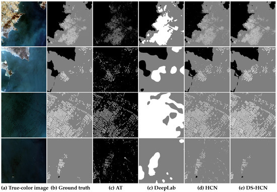 Although HCN shows its good ability to extract rafts, there are still many false-positive errors in its results, and those error-pixels are located around the coastline and on the sea, where the places have complex texture. This phenomenon indicates that the basic HCN with a small receptive field overly focuses on small-scale features and ignores the large-scale information. Thus, DS-HCN combines a large receptive field to overcome this shortcoming and makes it possible to mine the association between multiple targets. Based on Figure 8 and Table 3, DS-HCN achieves the best performance and suppresses most of the false-positive errors by using prior information that rafts densely gather together and only exist on the sea.