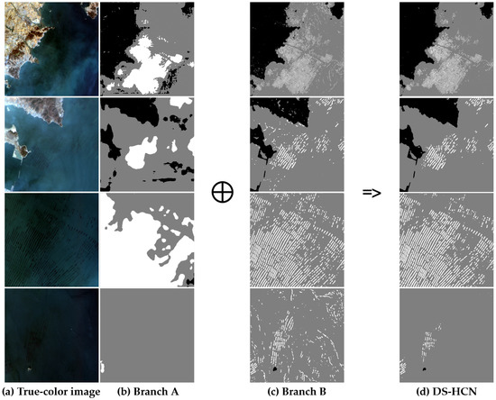 Branch A, a small-scale HCN-like branch, contributes to the clear boundary for each raft, as shown in the third column in Figure 10. However, in a complexly practical situation, many other objectives would be identified by mistake. To overcome this weakness, Branch B is used to contribute to the general distribution of each category. Further, when combining the two contributions, spatial relations will become apparent. For instance, if a pixel is considered as raft by Branch A but sea by Branch B, then this pixel will be confirmed as the sea with high probability in the end, since this pixel is out of rafts’ range, as shown in the fourth row of Figure 10. Therefore, by integrating dual branches, it makes our method possible to learn some prior information about spatial relations, and then each branch will have its specifically practical meaning.